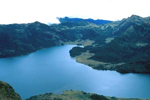Within Ecuador's system of protected natural areas, Cayambe-Coca Ecological Reserve is considered to have the greatest diversity of flora and fauna. It is an excellent place for bird-watching, with some 900 species of birds having been recorded here. Cayambe-Coca is a large reserve covering many life zones from the summit of Cayambe at 5790 meters (18,997 feet), down to Amazon rain forest. The reserve includes 81 different lakes, many of them wild and difficult to access. This trek passes through the northwest of the Cayambe-Coca Reserve, a high area with beautiful glacial valleys, rugged peaks, and mostly undisturbed vegetation. The route goes from Laguna San Marcos north to Laguna Puruhanta, through some truly wild country. Both large lakes are popular fishing spots, with abundant trout, but few people venture far beyond the access points; you are likely to go for days without meeting another party. A shorter loop in the Laguna San Marcos area is also mentioned below. This high páramo, with beautiful views of snow-capped Cayambe, is among the few places in Ecuador where you can see the Andean Condor. There are also hummingbirds, guans, Red-backed Hawks, and tanagers. Waterfowl include the Andean Duck, Andean Teal, and Andean Gull. This is likewise home to the Spectacled Bear, White-tailed deer, and Mountain Tapir. The vegetation is that of a wet páramo, similar to the Llanganates (see A Living Sponge in Trek 16). There are many highland ferns, mosses, and cushion plants, but also plants found in drier areas such as chuquiraguas and gentians. Along the lake shores and in the Río Pisque valley are rich cloud forests. A project to provide irrigation for the flower growing valleys of Cayambe and Tabacundo is being built in the Laguna San Marcos area. As a result, the level of the lake might change. At the northern end of the park is a buffer zone with forests administered by local communities, including Nueva América. They are trying to encourage eco-tourism as a form of sustainable economic development. Here too, a waterworks project is under construction to divert water from the Río Palaucu for irrigation in the Pimampiro valley.