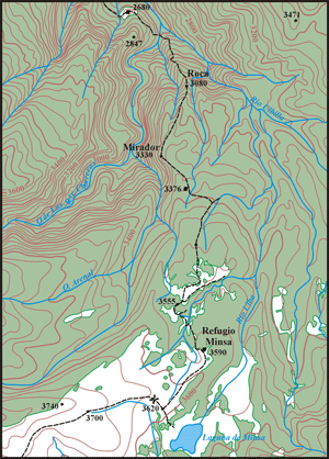 Rock steps The closer you come to the altitude of 3100 m, the sharper the ridge becomes. Some 50 meters above a cracked rock, on 3080 meters two 6 meter high vertical rock steps have to be managed. On the left side of the ridge there is a land slide. Some years ago the track might have disappeared due to this landslide. The easiest way to proceed is by rappelling twice over the two steps. It would be possible to climb down, but at least a UIAA III has to be managed. On 3030 meter you get to the cracked rock. On the left side there is a huge rocky bath, which could be used to place a tent. Follow the guts of the ridge, jumping from one rock to the other. River junction. On 2600 meters, some 50 meters west of the junction between the Río de las Siete Chorreras and the Río Ulba you reach finally the Río de las Siete Chorreras. Cross the river and search for an entry to the forest. Some years ago there must have been a land slide. The soil is rocky, dense bushes cover the area of the land slide. Crawl under the bushes 80 meters uphill (280°) over the area of the landslide. On the right side of the land slide, in a steep area you should find the old track. Following the track you will ascend other 40 meters till you come to the highest point on 2720 meters. The track circulates the ridge of the point 2847 meters (on the IGM 1:50,000 topo map of the year 2000). On 2680 meters finally you come to the first pasture exploited till our days (789545E, 840442N). It's very important to find the old track of the path. Never follow the Río Ulba. The river soon enters a deep canyon, there is no way coming through. Enjoy your trip! Günter Schmudlach