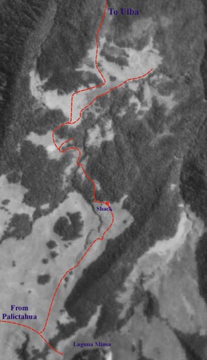 Günter Schmudlach of Switzerland, author of Bergführer Ecuador (Panico Alpinverlag, 2001), did this trek in November 2002. He was among the first people to return to the area since the reactivation of the Tungurahua Volacano in October 1999. We are grateful to Günter for the following notes. Entry point to the forest. From the shack at Laguna Minsa a confusing network of animal tracks lead to the north. A detailed description would be difficult. The aerial photo (right) shows the correct route. It's highly recommended to explore the correct route the day before. For the owner of a GPS it may help to know, that the entry point lies at the coordinates 790374E, 9837570N (WGS 84; add 259 meters N and 374 meters E to convert to PSAD 56). Trellis. At the altitude of 3470 meters the track crosses the remnants of a trellis. There is not left more then one stake on the left side and an other on the right side. It's obvious, that years ago there must have been a crop field below this point. In the next section an annoying net of suro covers the track. Some misleading traces guide to the right and end in the bed of the upper west wing Río Ulba. Try to go exactly downhill to find again the right trace. On around 3420 meters the tracks gradually turn to the left (290°). On 3380 m the track crosses a small river, some 80 m later you get to the shack on 3376 m (790284E, 832286N). The shack was used by the park guardian some years ago and is in a miserable state.